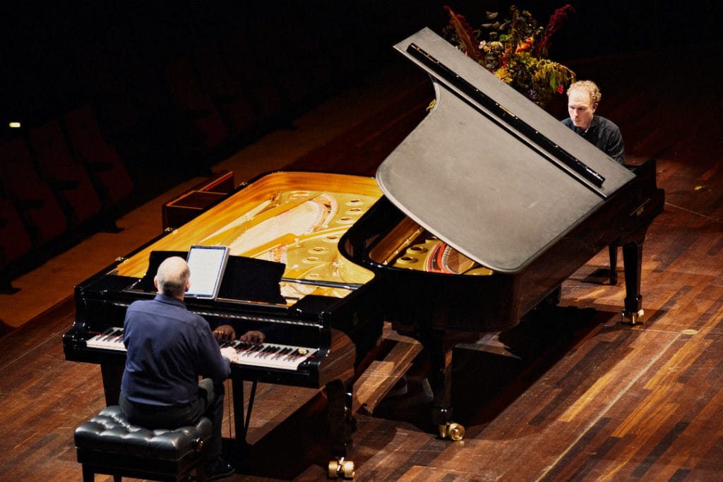 Last week, Ralph has toured The Netherlands with the complete works for piano duo by John Adams, including the Dutch premieres of Roll over Beethoven and the pianoduo version of Short Ride in a Fast Machine. As the planned piano duo partner Joanna MacGregor unfortunately was unable to do the tour, Dutch pianist Maarten van Veen substituted for the complete series. The program was completed by Ralph playing Beethoven’s Sonata opus 110 and John Adams’ Phrygian Gates, all in presence of the composer during one of the concerts. Ralph and Maarten also recorded the duo works on CD for Naxos – stay tuned for release dates! This CD will be a follow-up to the CD published earlier, and available here.