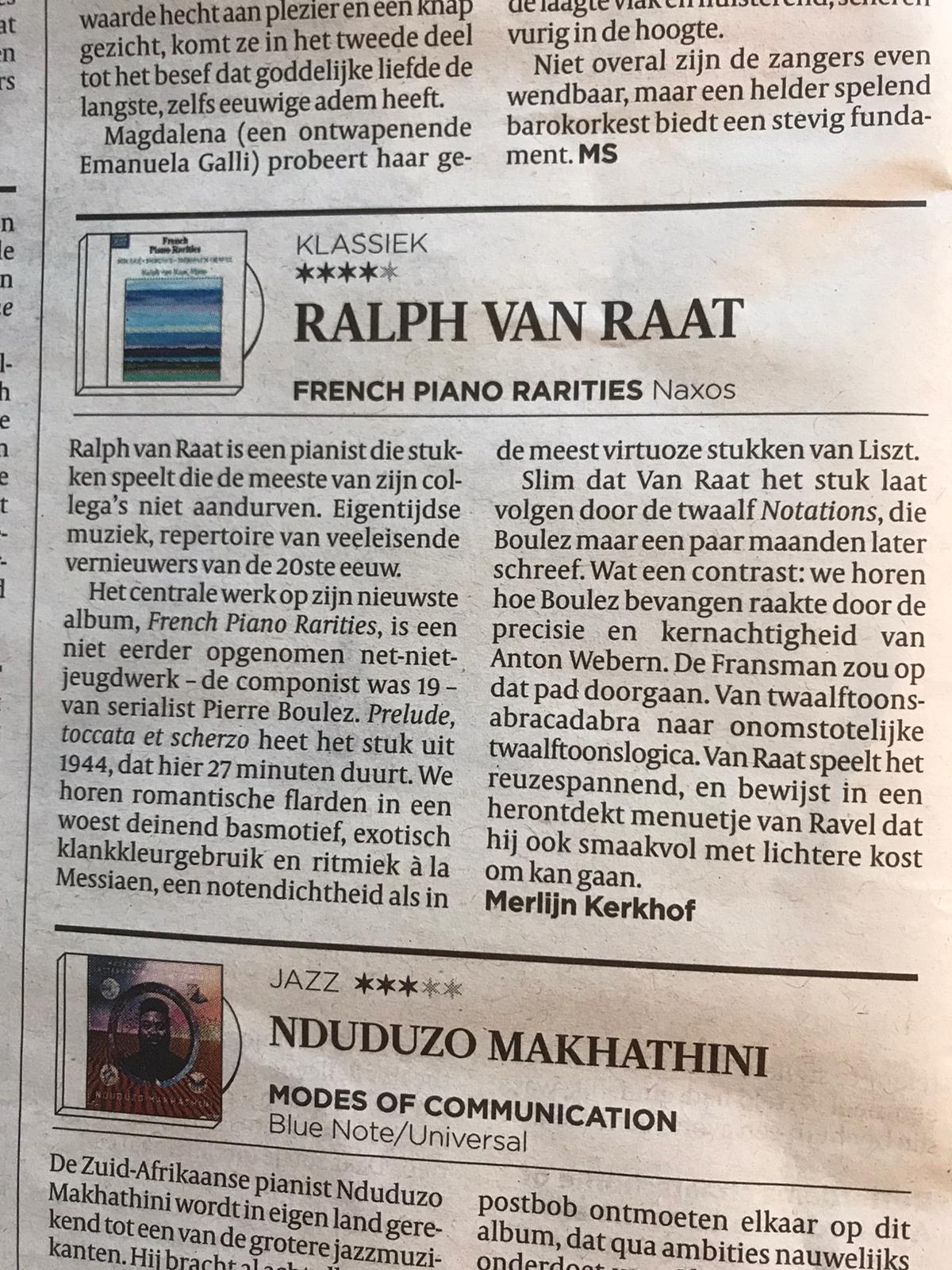 On Friday, May 29th, an extended interview with Ralph, in the context of his new CD with French piano rarities, has been published by newspaper Trouw (written by Sandra Kooke). Also, the first review was published in newspaper De Volkskrant, in which the album is much praised: ‘Ralph van Raat is a pianist who plays pieces that most of his colleagues don’t dare. […] He plays it all with great excitement’. The CD has also been described as ‘very refined’ in this Belgian review by Michel Dutrieue. Raymond Bisha has made a podcast about the CD here.
