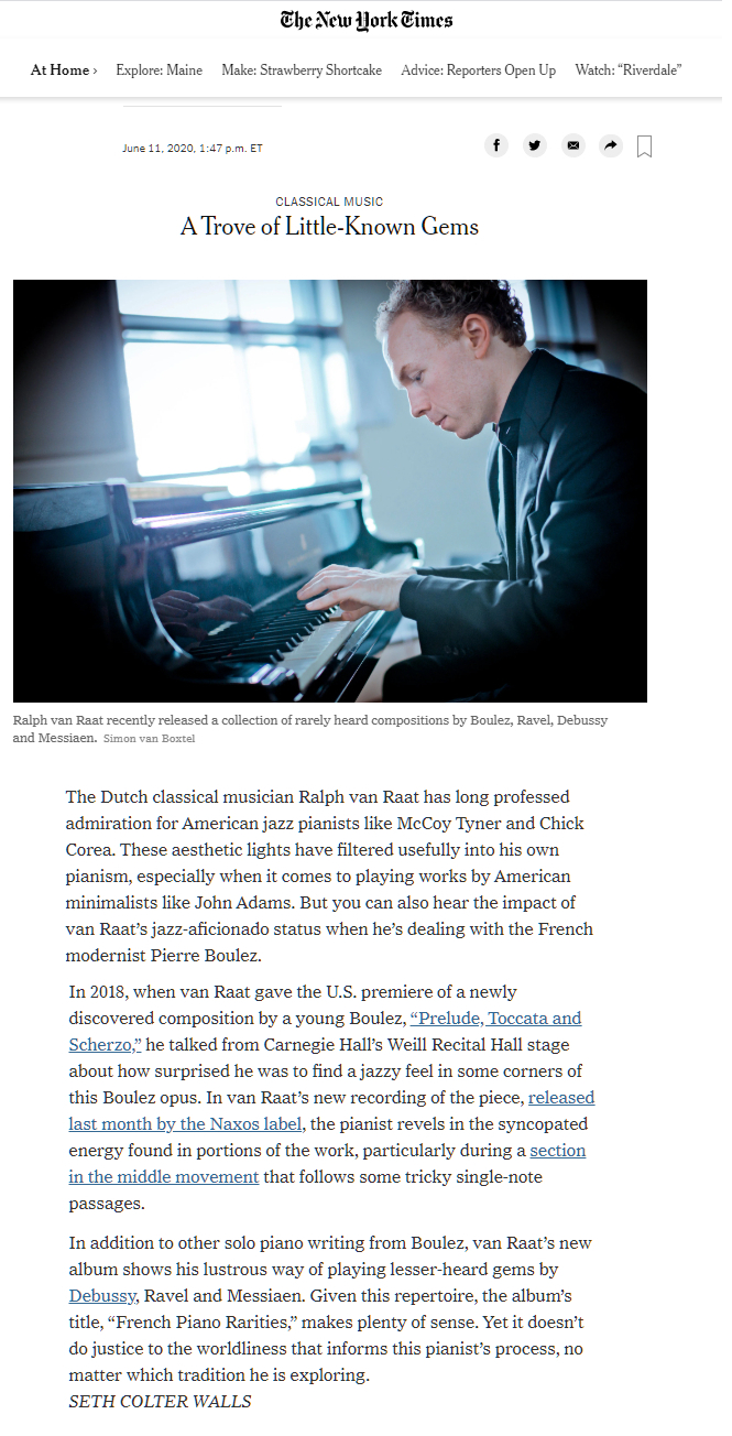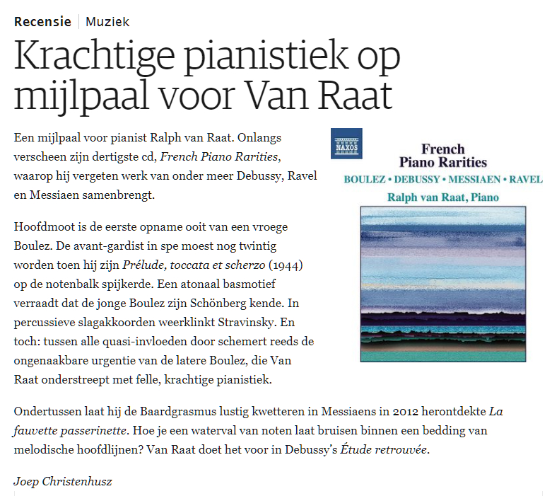 Today, music critic Seth Colter Walls wrote a very positive review about Ralph’s new CD in The New York Times: ‘In addition to other solo piano writing from Boulez, van Raat’s new album shows his lustrous way of playing lesser-heard gems by Debussy, Ravel and Messiaen. Given this repertoire, the album’s title, “French Piano Rarities,” makes plenty of sense. Yet it doesn’t do justice to the worldliness that informs this pianist’s process, no matter which tradition he is exploring.’ Dutch NRC Handelsblad critic Joep Christenhusz describes Ralph’s playing as ‘alert, powerful pianism‘ in this review!